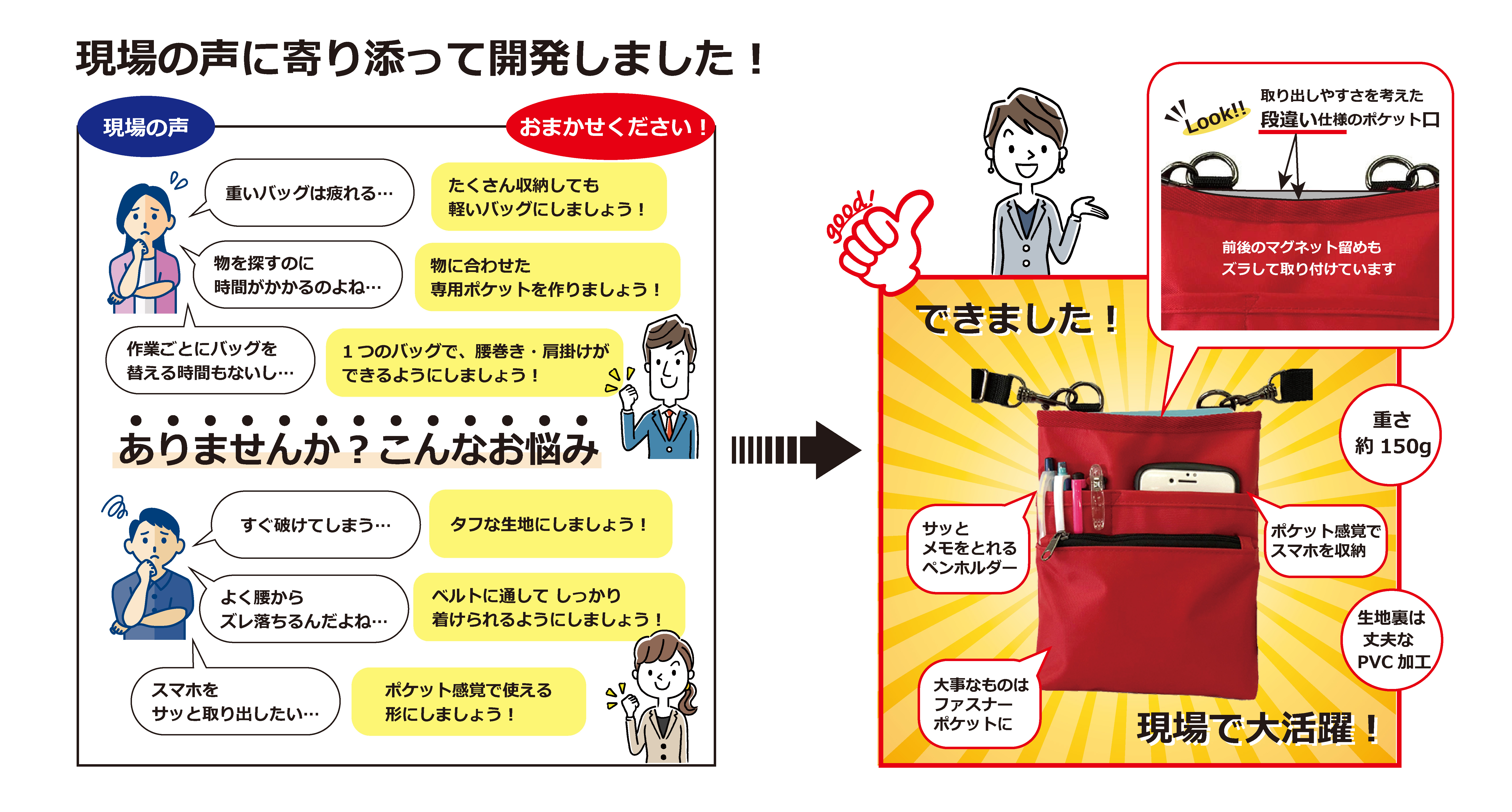 福祉ワーカーのためのウエストポーチ(介護用ウエストポーチ)は、介護職員の働きかたに応じてより良い物にするため、素材も含めて調整を行い続けていく努力をしています。