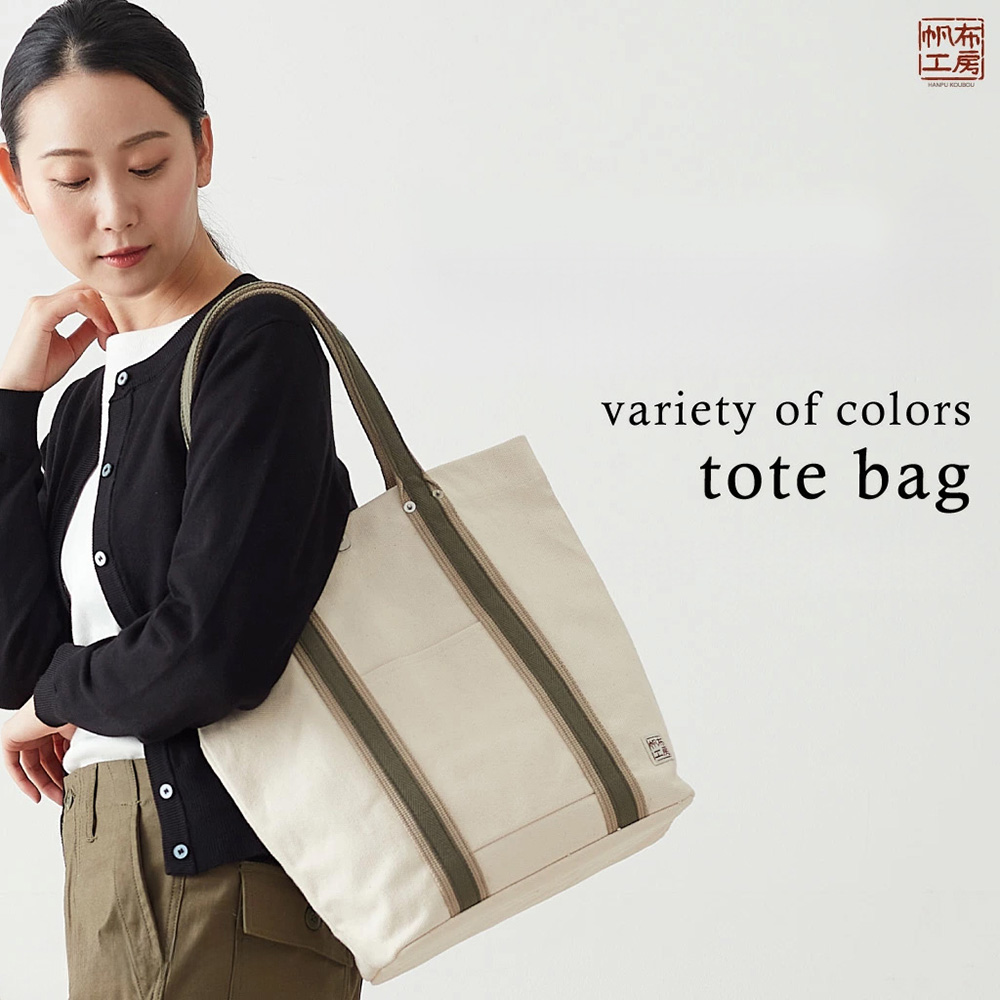 アクセントに入った持ち手のカラーコンビのベルトラインがとってもオシャレで、丈夫なトートバッグ。コシのある糊付け加工を施した4 号帆布を使用した「帆布工房LINE シリーズ」のトートバッグです。