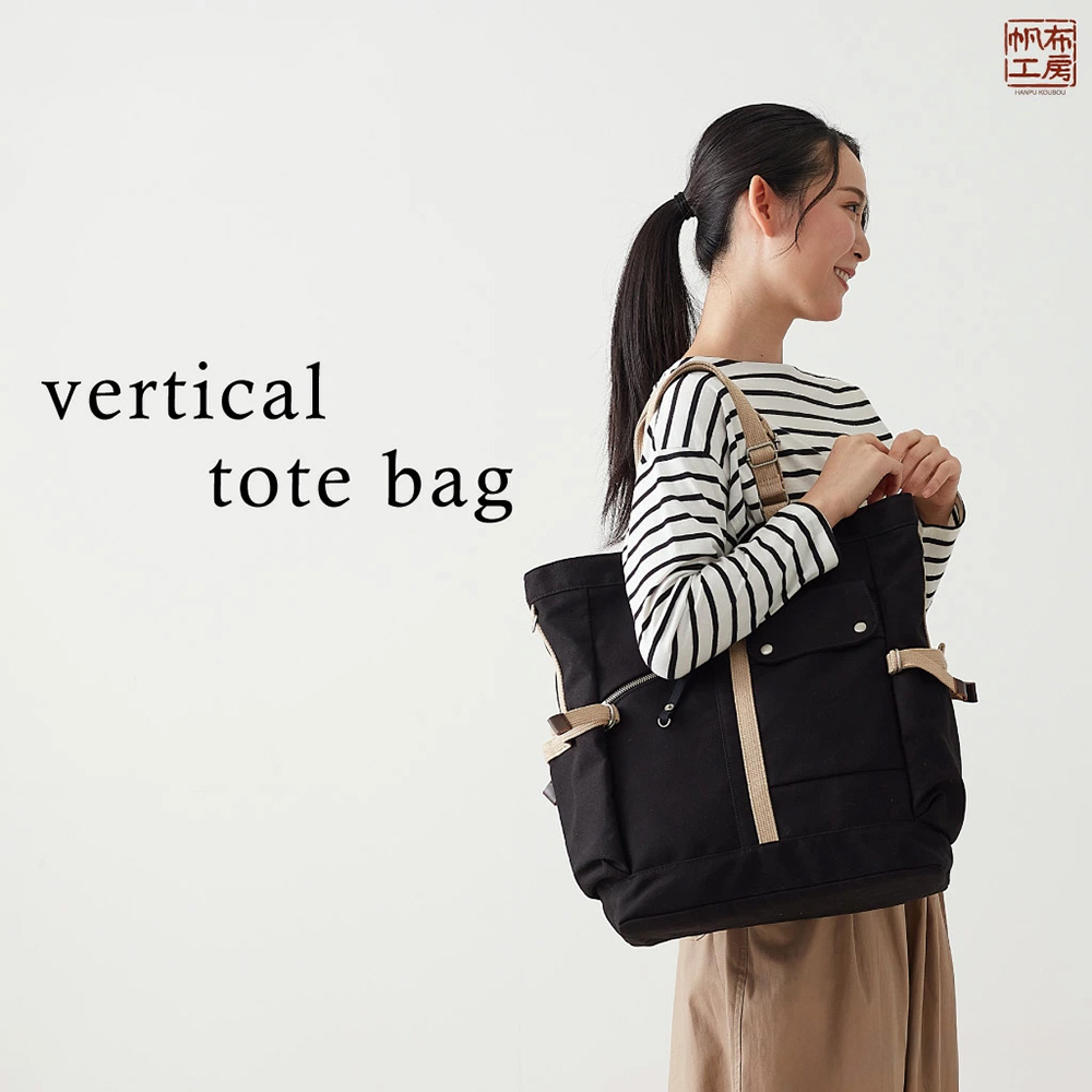 持ち手部分やサイドの長さを調節できる、「帆布工房CONTROLIIシリーズ」の縦型トートバッグ。外側、内側共にポケットが充実しており小物の収納にも困りません。