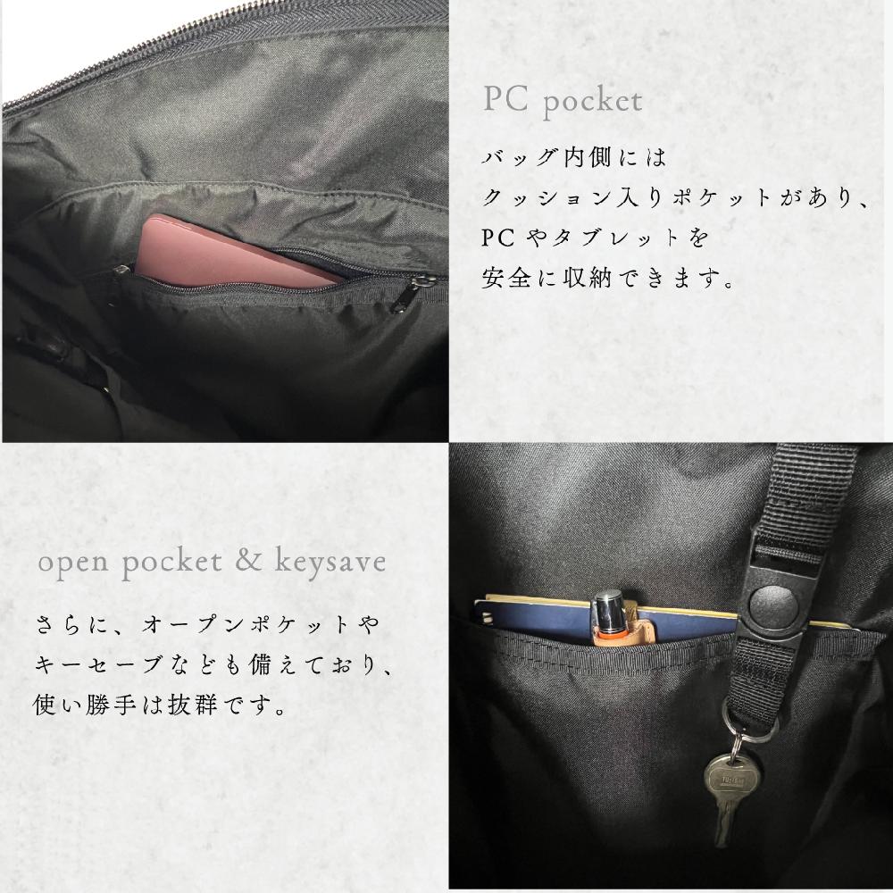 内側にはPCやタブレットを収納するのに便利なクッション入りポケットのほか、