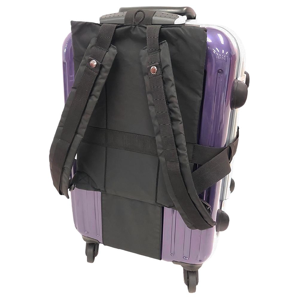 キャリーケースやスーツケースにベルトを回して留めるだけで、リュックのように背負えます!