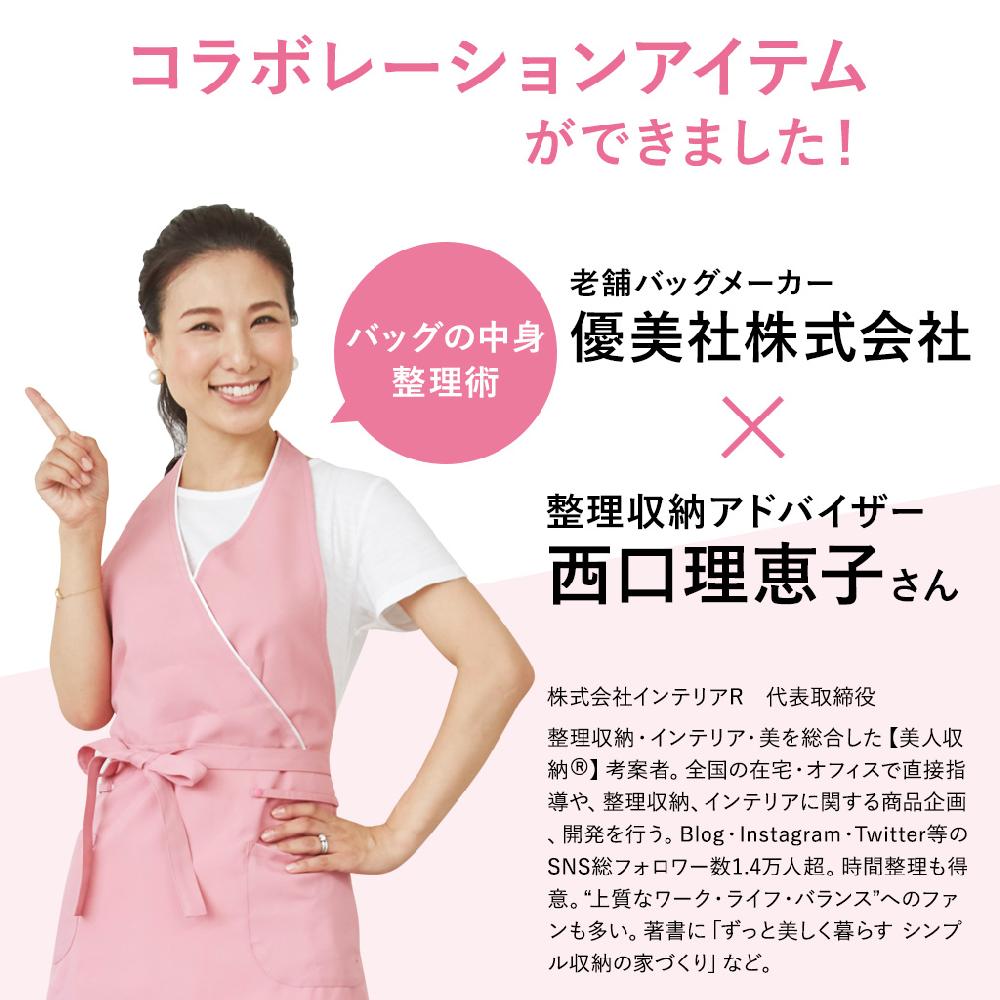 整理収納アドバイザー「西口理恵子」さんによる収納法を具現化し、スタイリッシュでスマートなかばんをラインナップしました。普段使いしやすいショルダーバッグやリュックサックなどを通して、従来の機能実用だけではない大人の女性が使えるイメージを提案しています。